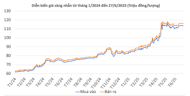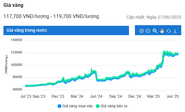 | Giá vàng nhẫn 99,99 | 27/6/2025 | Thay đổi (nghìn đồng/lượng) | ||