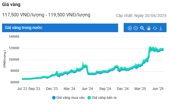 | Giá vàng nhẫn 99,99 | 30/6/2025 | Thay đổi (nghìn đồng/lượng) | ||
