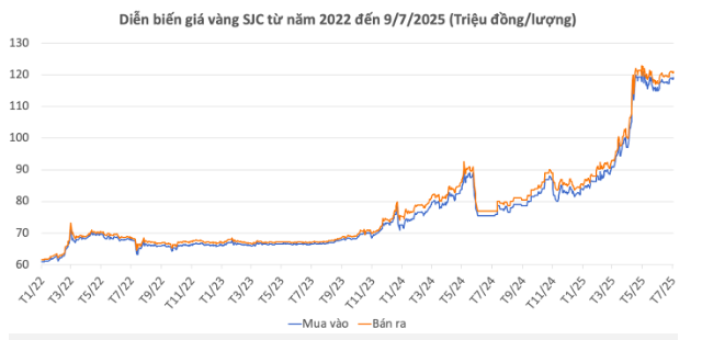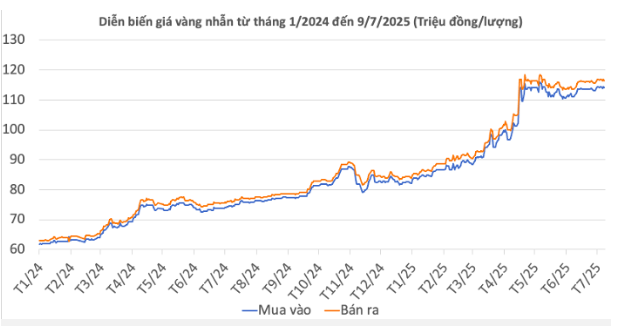 | Giá vàng nhẫn 99,99 | 9/7/2025 | Thay đổi (nghìn đồng/lượng) | ||
