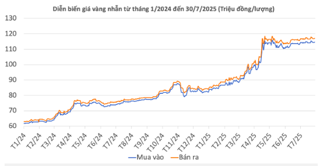 | Giá vàng nhẫn 99,99 | 30/7/2025 | Thay đổi (nghìn đồng/lượng) | ||