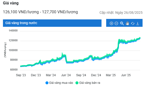 Sau đợt tăng, giá vàng hôm nay tiếp tục lập kỷ lục, được mua vào ở 125,1 - 126,1 triệu đồng ở chiều mua vào và 127,7 triệu đồng ở chiều bán ra.