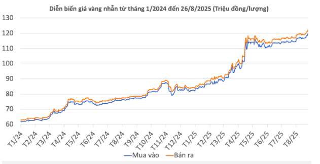 | Giá vàng nhẫn 99,99 | 26/8/2025 | Thay đổi (nghìn đồng/lượng) | ||