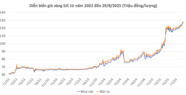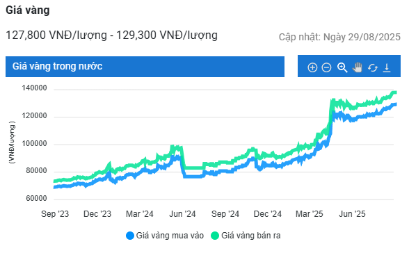 Theo đó, giá vàng hôm nay đạt mức kỷ lục mới, 126,4 - 127,4 triệu đồng ở chiều mua vào và 128,9 triệu đồng ở chiều bán ra.