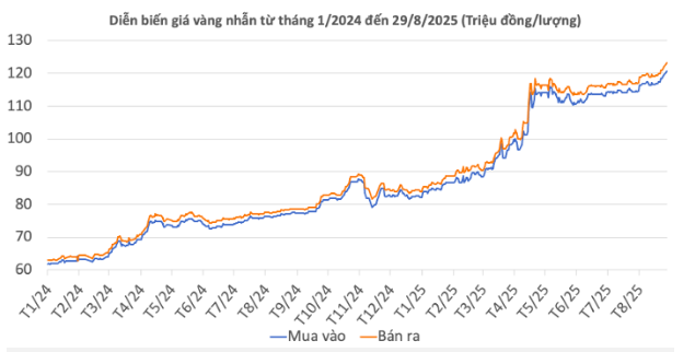 | Giá vàng nhẫn 99,99 | 29/8/2025 | Thay đổi (nghìn đồng/lượng) | ||