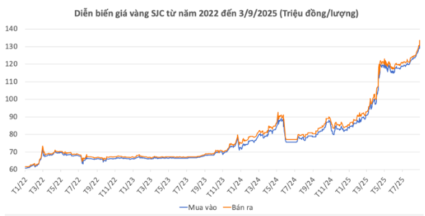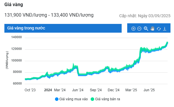 Theo đó, giá vàng hôm nay được mua vào ở 131 - 131,9 triệu đồng ở chiều mua vào và 133,4 triệu đồng ở chiều bán ra. Đây là mức kỷ lục mới đối với vàng miếng trong nước.