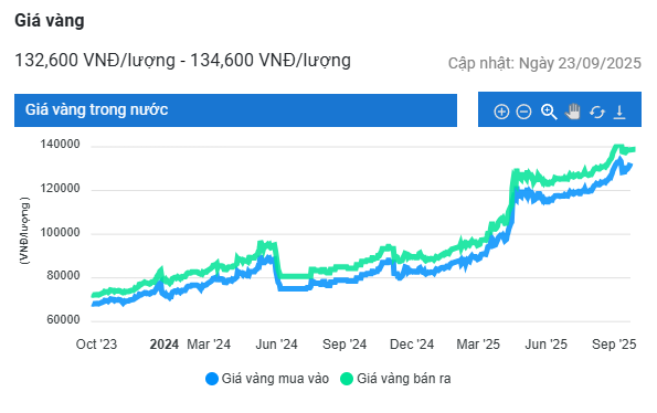 Theo đó, giá vàng hôm nay được mua vào trong khoảng 132 - 132,6 triệu đồng/lượng và bán ra ở 134,6 triệu đồng.