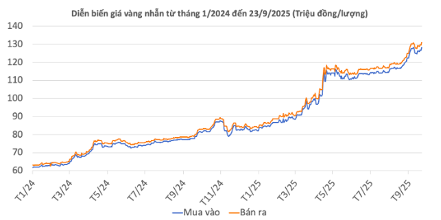 Tương tự, giá vàng nhẫn tăng khoảng 1,5 - 1,7 triệu đồng/lượng lên 128,3 - 128,5 triệu đồng/lượng ở chiều mua vào và 131 - 131,5 triệu đồng ở chiều bán ra.