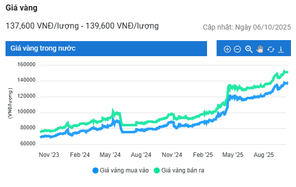 Theo đó, giá vàng hôm nay được mua vào ở 137 - 137,6 triệu đồng/lượng và bán ra ở 139,6 triệu đồng.