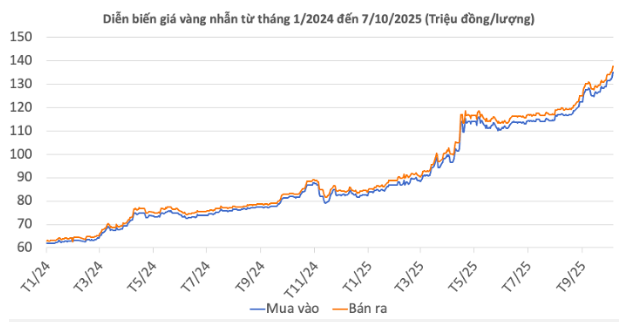 Trên thị trường vàng nhẫn, giá tăng thêm 1 - 1,7 triệu đồng/lượng tại tất cả các hệ thống, kéo giá mua vào lên 135 - 135,1 triệu đồng và bán ra ở 137,7 - 138,1 triệu đồng.