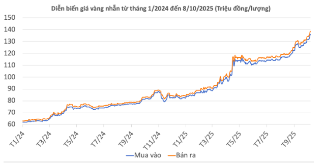 | Giá vàng nhẫn 99,99 | 8/10/2025 | Thay đổi (nghìn đồng/lượng) | ||