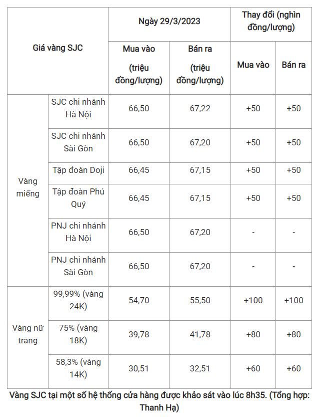 Giá vàng trong nước ngày 29/3 ghi nhận tăng 50.000 đồng/lượng tại một số hệ thống kinh doanh.