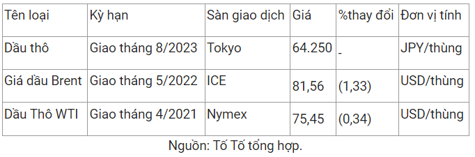 Giá dầu thô ngọt nhẹ WTI của Mỹ giảm 0,34% xuống 75,45 USD/thùng vào lúc 7h27 (giờ Việt Nam), trong khi giá dầu thô Brent giao tháng 5 giảm 1,33% xuống 81,56 USD/thùng.
