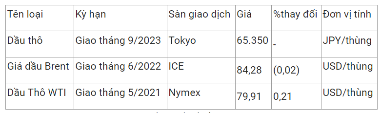 Giá dầu thô ngọt nhẹ WTI của Mỹ tăng 0,21% lên 79,91 USD/thùng vào lúc 7h39 (giờ Việt Nam), trong khi giá dầu thô Brent giao tháng 6 giảm 0,02% xuống 84,28 USD/thùng.