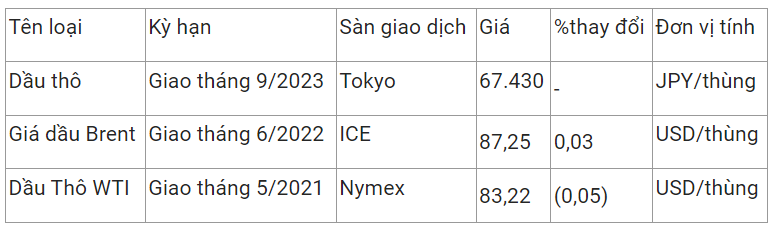 Giá dầu thô ngọt nhẹ WTI của Mỹ giảm 0,05% xuống 83,22 USD/thùng vào lúc 7h28 (giờ Việt Nam), trong khi giá dầu thô Brent giao tháng 6 tăng 0,03% lên 87,25 USD/thùng.