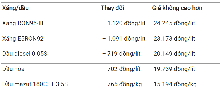 Theo đó, sau khi thực hiện việc trích lập và chi sử dụng quỹ Bình ổn, giá bán các mặt hàng xăng dầu tiêu dùng phổ biến trên thị trường như sau: