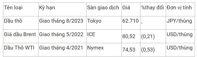 Giá dầu thô ngọt nhẹ WTI của Mỹ giảm 0,53% xuống 74,53 USD/thùng vào lúc 7h24 (giờ Việt Nam), trong khi giá dầu thô Brent giao tháng 5 giảm 0,21% xuống 80,52 USD/thùng.