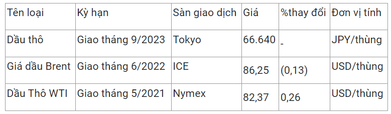 Giá dầu thô ngọt nhẹ WTI của Mỹ tăng 0,26% lên 82,37 USD/thùng vào lúc 7h34 (giờ Việt Nam), trong khi giá dầu thô Brent giao tháng 6 giảm 0,13% xuống 86,25 USD/thùng.