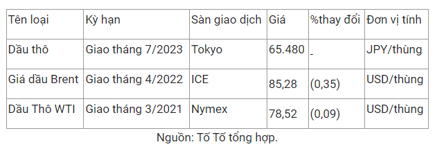 Giá dầu thô ngọt nhẹ WTI của Mỹ giảm 0,09% xuống 78,52 USD/thùng vào lúc 7h25 (giờ Việt Nam), trong khi giá dầu thô Brent giao tháng 4 giảm 0,35% xuống 85,28 USD/thùng.