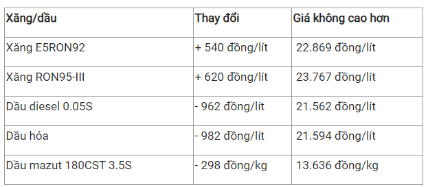 Theo đó, sau khi thực hiện việc trích lập và chi sử dụng quỹ Bình ổn, giá bán các mặt hàng xăng dầu tiêu dùng phổ biến trên thị trường như sau:
