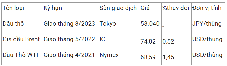 Giá dầu thô ngọt nhẹ WTI của Mỹ tăng 1,45% lên 68,59 USD/thùng vào lúc 7h27 (giờ Việt Nam), trong khi giá dầu thô Brent giao tháng 5 tăng 0,52% lên 74,82 USD/thùng.