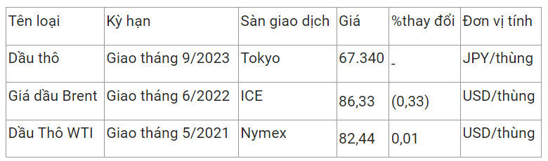 Giá dầu thô ngọt nhẹ WTI của Mỹ tăng 0,01% lên 82,44 USD/thùng vào lúc 7h56 (giờ Việt Nam), trong khi giá dầu thô Brent giao tháng 6 giảm 0,33% xuống 86,33 USD/thùng.