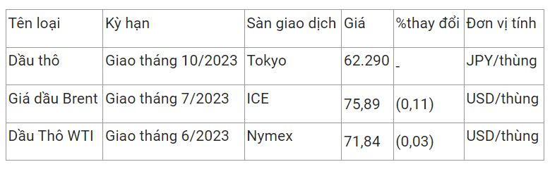 Giá dầu thô ngọt nhẹ WTI của Mỹ giảm 0,03% xuống 71,84 USD/thùng vào lúc 7h11 (giờ Việt Nam), trong khi giá dầu thô Brent giao tháng 7 giảm 0,11% xuống 75,89 USD/thùng.