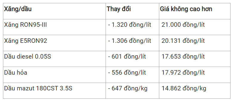 Theo đó, sau khi thực hiện việc trích lập và chi sử dụng quỹ Bình ổn, giá bán các mặt hàng xăng dầu tiêu dùng phổ biến trên thị trường như sau:
