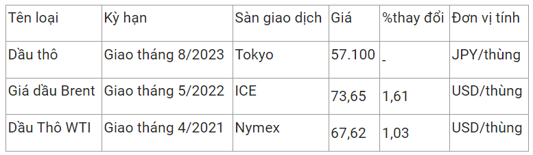 Giá dầu thô ngọt nhẹ WTI của Mỹ tăng 1,03% xuống 67,62 USD/thùng vào lúc 8h19 (giờ Việt Nam), trong khi giá dầu thô Brent giao tháng 5 tăng 1,61% lên 73,65 USD/thùng.