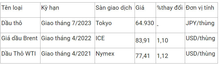Giá dầu thô ngọt nhẹ WTI của Mỹ tăng 1,12% lên 77,41 USD/thùng vào lúc 4h00 (giờ Việt Nam), trong khi giá dầu thô Brent giao tháng 4 tăng 1,1% lên 83,91 USD/thùng.