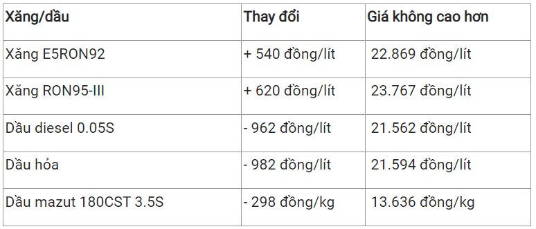 Theo đó, sau khi thực hiện việc trích lập và chi sử dụng quỹ Bình ổn, giá bán các mặt hàng xăng dầu tiêu dùng phổ biến trên thị trường như sau: