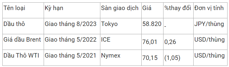 Giá dầu thô ngọt nhẹ WTI của Mỹ giảm 1,05% xuống 70,15 USD/thùng vào lúc 7h32 (giờ Việt Nam), trong khi giá dầu thô Brent giao tháng 5 tăng 0,26% lên 76,01 USD/thùng.