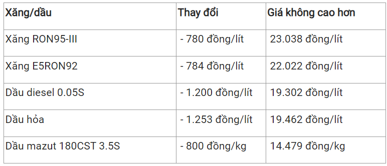 Theo đó, sau khi thực hiện việc trích lập và chi sử dụng quỹ Bình ổn, giá bán các mặt hàng xăng dầu tiêu dùng phổ biến trên thị trường như sau: