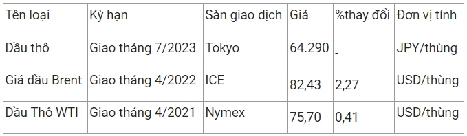 Giá dầu thô ngọt nhẹ WTI của Mỹ tăng 0,41% lên 75,7 USD/thùng vào lúc 7h50 (giờ Việt Nam), trong khi giá dầu thô Brent giao tháng 4 tăng 2,27% lên 82,43 USD/thùng.