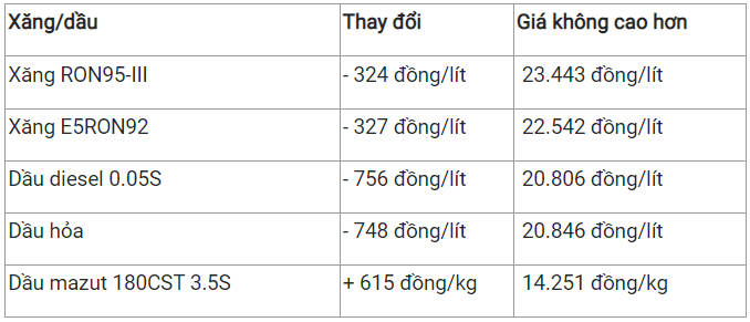 Theo đó, sau khi thực hiện việc trích lập và chi sử dụng quỹ Bình ổn, giá bán các mặt hàng xăng dầu tiêu dùng phổ biến trên thị trường như sau: