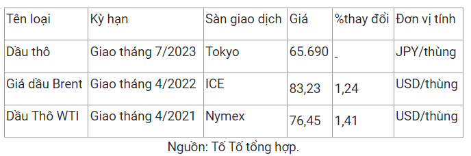 Chốt phiên giao dịch, giá dầu Brent tăng 1,2% lên 83,16 USD/oune, trong khi giá dầu WTI của Mỹ tăng 1,2% lên 76,32 USD.