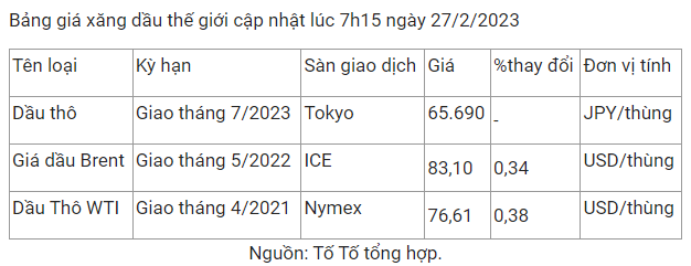 Bảng giá xăng dầu thế giới cập nhật lúc 7h15 ngày 27/2/2023