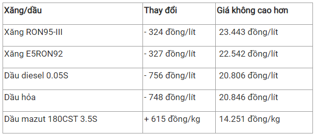 Theo đó, sau khi thực hiện việc trích lập và chi sử dụng quỹ Bình ổn, giá bán các mặt hàng xăng dầu tiêu dùng phổ biến trên thị trường như sau:
