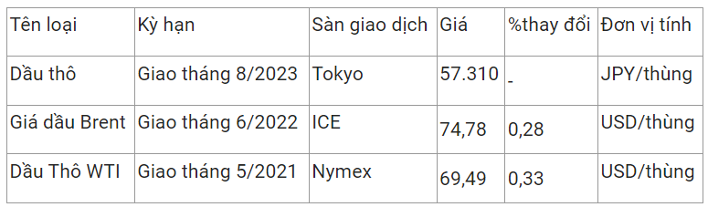Giá dầu thô ngọt nhẹ WTI của Mỹ tăng 0,33% lên 69,49 USD/thùng vào lúc 8h01 (giờ Việt Nam), trong khi giá dầu thô Brent giao tháng 6 tăng 0,28% lên 74,78 USD/thùng.