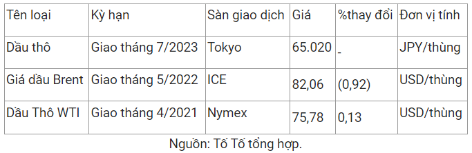 Giá dầu thô ngọt nhẹ WTI của Mỹ tăng 0,13% lên 75,78 USD/thùng vào lúc 7h30 (giờ Việt Nam), trong khi giá dầu thô Brent giao tháng 5 giảm 0,92% xuống 82,06 USD/thùng.