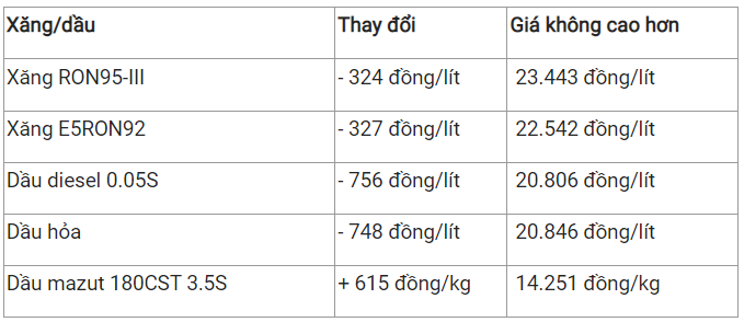 Theo đó, sau khi thực hiện việc trích lập và chi sử dụng quỹ Bình ổn, giá bán các mặt hàng xăng dầu tiêu dùng phổ biến trên thị trường như sau: