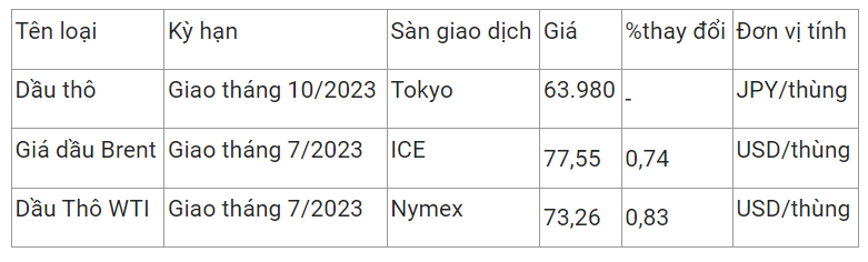 Giá dầu thô ngọt nhẹ WTI của Mỹ tăng 0,83% lên 73,26 USD/thùng vào lúc 7h10 (giờ Việt Nam), trong khi giá dầu thô Brent giao tháng 7 tăng 0,74% lên 77,55 USD/thùng.