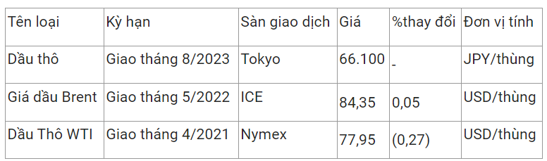 Giá dầu thô ngọt nhẹ WTI của Mỹ giảm 0,27% xuống 77,95 USD/thùng vào lúc 7h39 (giờ Việt Nam), trong khi giá dầu thô Brent giao tháng 5 tăng 0,05% lên 84,35 USD/thùng.