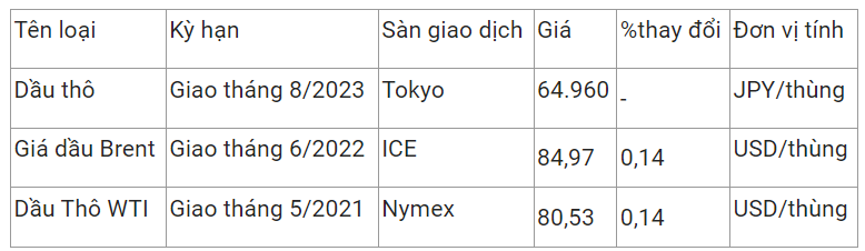 Giá dầu thô ngọt nhẹ WTI của Mỹ tăng 0,14% lên 80,53 USD/thùng vào lúc 7h17 (giờ Việt Nam), trong khi giá dầu thô Brent giao tháng 6 tăng 0,14% lên 84,97 USD/thùng.