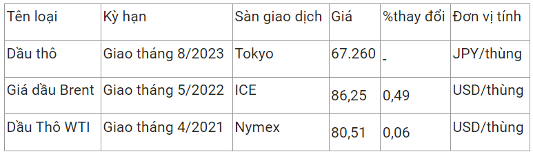 Giá dầu thô ngọt nhẹ WTI của Mỹ tăng 0,06% lên 80,51 USD/thùng vào lúc 7h59 (giờ Việt Nam), trong khi giá dầu thô Brent giao tháng 5 tăng 0,49% lên 86,25 USD/thùng.