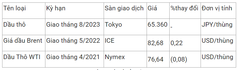 Giá dầu thô ngọt nhẹ WTI của Mỹ giảm 0,08% xuống 76,64 USD/thùng vào lúc 8h01 (giờ Việt Nam), trong khi giá dầu thô Brent giao tháng 5 tăng 0,22% lên 82,68 USD/thùng.