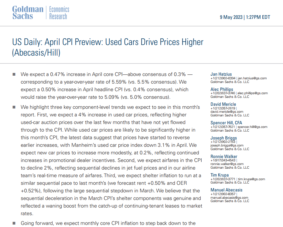 Goldman Sach -US Daily: April CPI Preview: Used Cars Drive Prices Higher (Abecasis/Hill) - Đánh giá CPI tháng 04/2023 trước thềm công bố