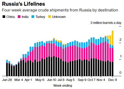 Lệnh cấm vận đối với dầu thô vận chuyển bằng đường biển của Nga từ châu Âu và mức giá trần đã chính thức có hiệu lực kể từ đầu tháng này. Tuy nhiên, để tránh mất những khách hàng cuối cùng còn lại của mình, Nga đã đề nghị giúp Ấn Độ nắm giữ các tàu chở dầu lớn để "lách" mức giá trần 60 USD/thùng.