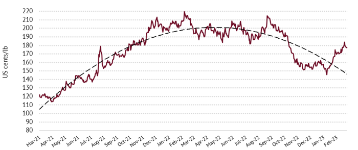 Tổ chức Cà phê Quốc tế (ICO) cho biết giá cà phê thế giới đã tăng 11,4% trong tháng 2 lên mức bình quân 174,8 US cent/pound. Trong khi đó, xuất khẩu cà phê toàn cầu tiếp tục giảm trong tháng 1 và 4 tháng đầu niên vụ 2022-2023.