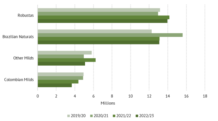 Xét theo khu vực, xuất khẩu cà phê của khu vực Nam Mỹ đã giảm 19,9% trong tháng đầu năm 2023 xuống còn 3,9 triệu bao, do tổng xuất khẩu của ba quốc gia sản xuất chính trong khu vực là Brazil, Colombia và Peru giảm 21%.