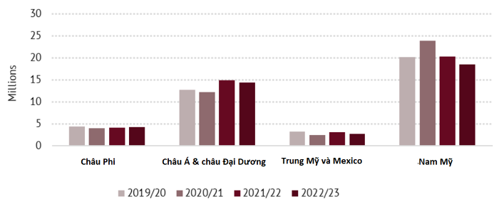 Tiếp đến là khu vực châu Á và châu Đại Dương, xuất khẩu cà phê của khu vực này đã giảm 17,2% so với cùng kỳ năm ngoái xuống 3,4 triệu bao trong tháng 1 và giảm 3,3% xuống 14,4 triệu bao trong 4 tháng đầu niên vụ 2022-2023.